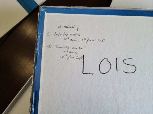You can see the two original missing pieces as well as the pieces Baxter got a hold of along the bottom edge. I still think it is a charming puzzle, though. I probably won’t keep it to redo since so many pieces are gone now, but I’m glad I got the chance to do it once.