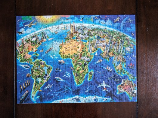 World Landmarks Map is a 300-piece puzzle from Ravensburger. It was designed for age 9+ with what they call XXL pieces. I got it because there is a new puzzle challenge on one of the Facebook groups I belong to that needed a puzzle with a map or globe. This one definitely fit that bill!