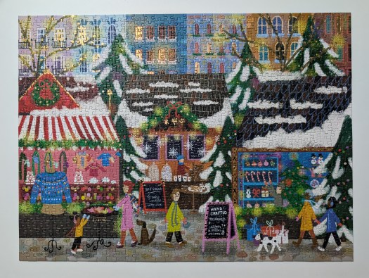Merry Market is a 1000-piece puzzle from Galison, and the artist is Joy LaForme. This was a lot of fun to put together with the market stalls and the row of buildings in the back. The colors are beautiful, and the foil accents add a special holiday touch. I started this one Christmas Day and finished it the day after Christmas.