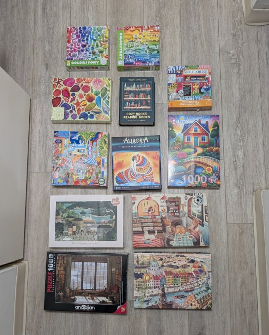Below is a picture of the puzzles I purchased over the last few weeks of 2025. I am currently on a puzzle buying moratorium because I started the year with 71 puzzles waiting to be done and they no longer fit comfortably on the shelf I have set aside for that purpose. My goal is to not buy any new puzzles until I have my to do list at 50 or below. It will be a challenge for sure!