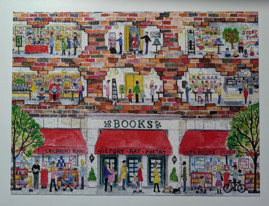 A Day at the Bookstore is a 1000-piece puzzle from Galison, and the artist is Michael Storrings. I am often drawn to his artwork, but I don’t do a lot of his puzzles because they can be quite challenging. For this one, the lower portion was pretty easy, but the upper portion was harder, especially the bricks!