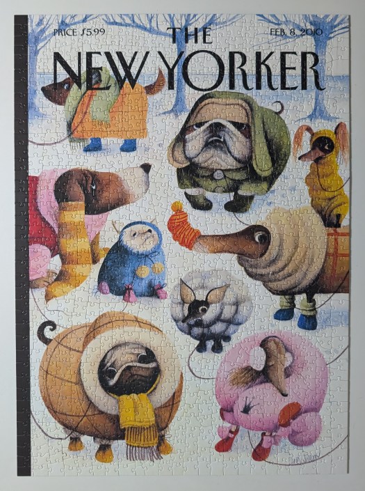 Baby, It’s Cold Outside is a 1000-piece puzzle from New York Puzzle Company, and the artist is Ana Juan. I got this one several months ago and was holding onto it until wintertime. It is a random-cut puzzle, which have traditionally been my least favorite to do, but I found this one to be more enjoyable than I expected. I think I must be getting used to the random-cut style because I am considering getting more of them.