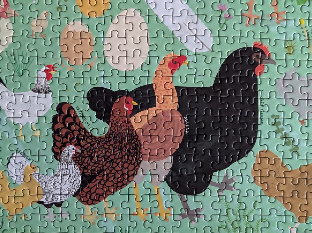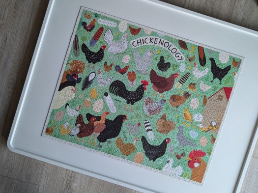 After doing it, I have mixed feelings about this puzzle. I love the image and really enjoyed all the different colors and textures of the chickens. There was some element on almost all of the pieces, so there weren’t too many that were all green. Also, the border and the background behind the word “Chickenology” reminds me of graph paper, which was a nice touch.