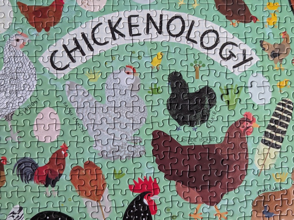 Chickenology is a 1000-piece puzzle from Princeton Architectural Press, and the artist is Camilla Pintonato. I have been interested in this puzzle for a while and was really excited to pick it up at a puzzle swap last November.