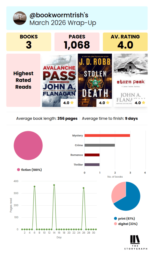 - I have read 16 books so far in 2026. My goal is 100, so I am 9 books behind. I do occasionally have times where I read less than my usual, so I’m sure it will pick up later in the year.