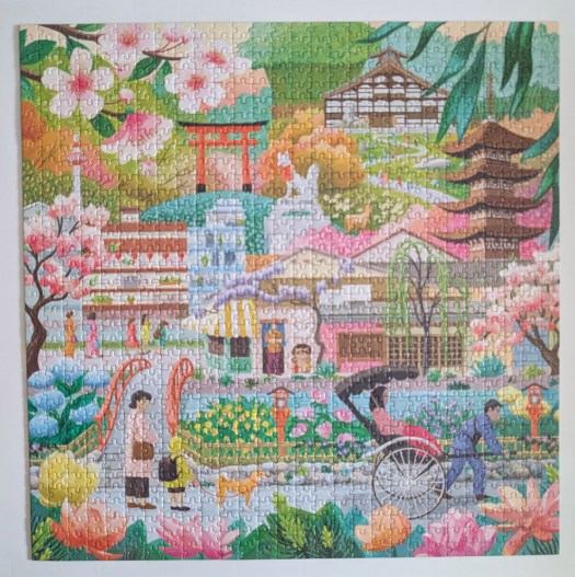 Seasons in Kyoto is a 1000-piece puzzle from eeBoo, and the artist is Jennifer Potter. I really enjoy eeBoo puzzles and this was no exception! The pastel color palette is a bit different than what I normally gravitate to but I found it soothing and beautiful. I love the interesting buildings and the variety of flowers.