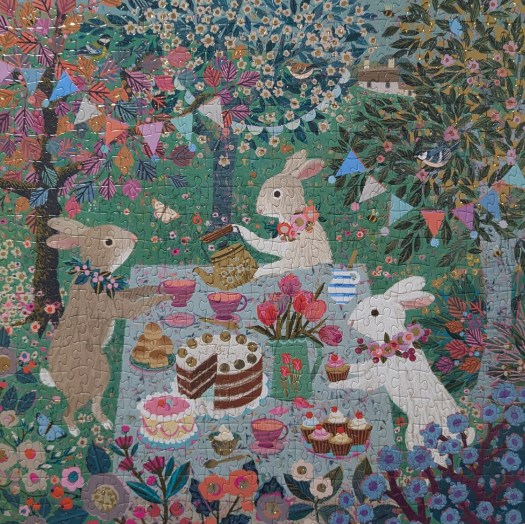 Spring Tea Party is a 500-piece puzzle from Galison, and the artist is Victoria Ball. I first did this one in April 2025 and decided to pull it out again this year on Easter weekend. It is such a fun little puzzle. I love the adorable bunnies having their tea party with all of the yummy food and festive decorations. I don’t think it’s really visible in the photo, but there are gold foil accents on the puzzle as well.