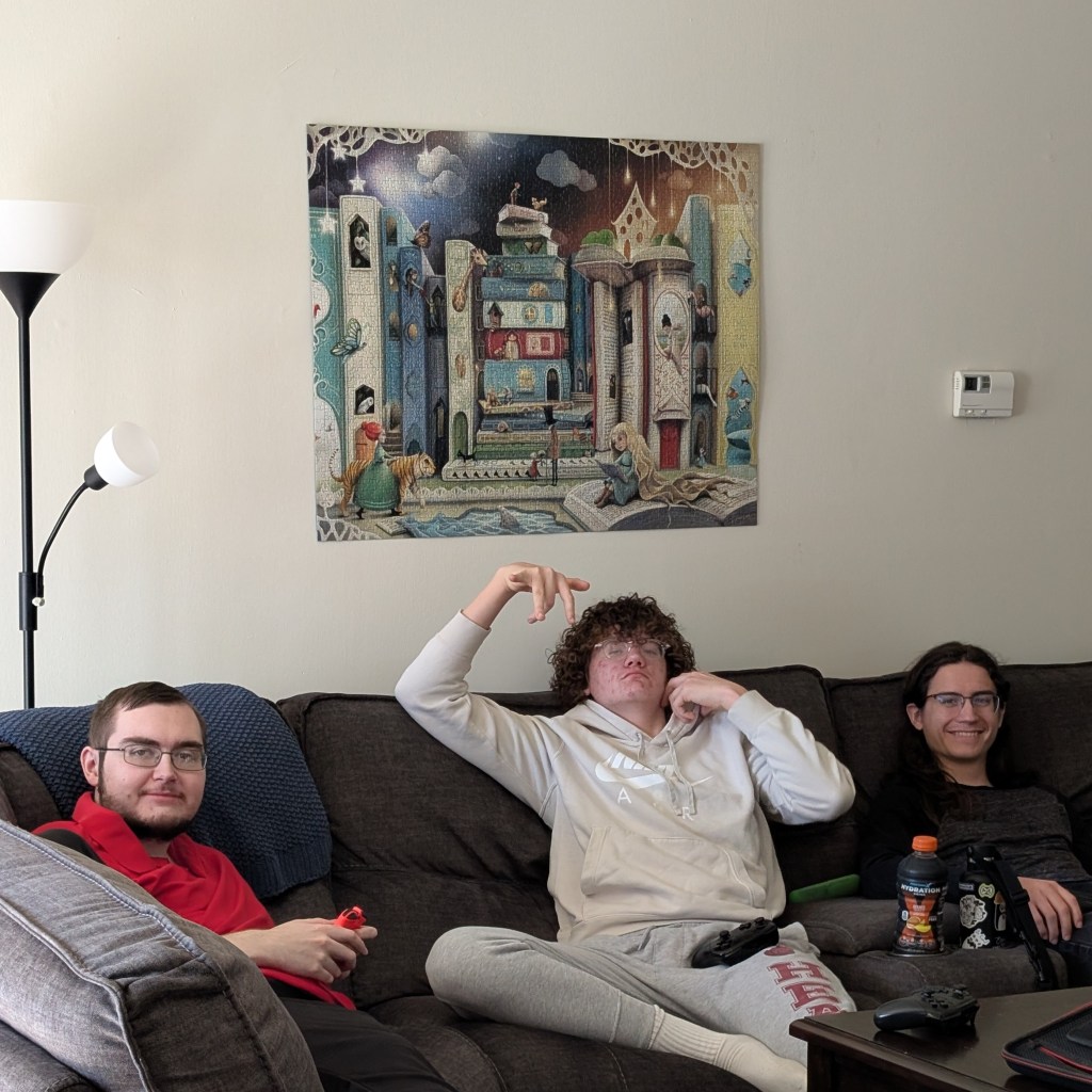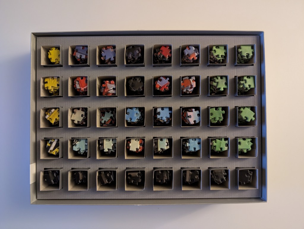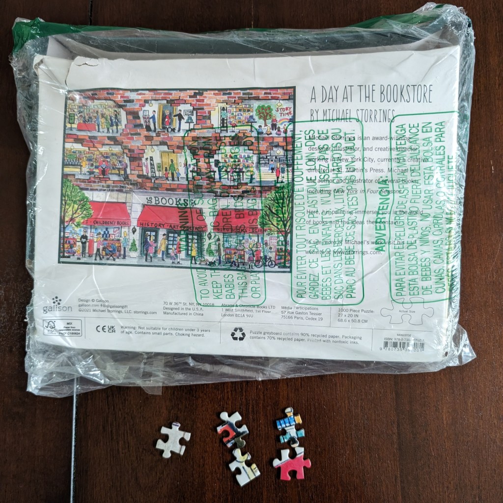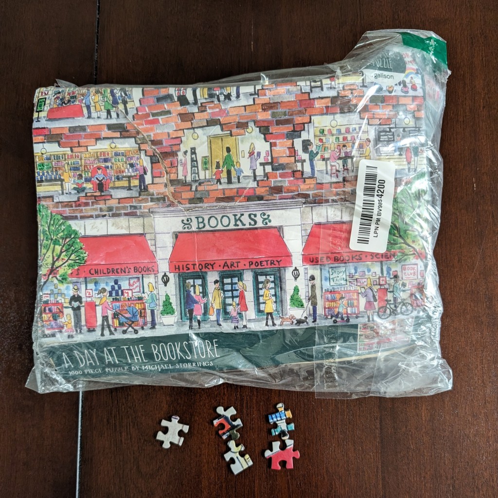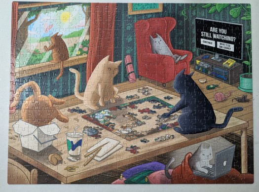 I really enjoyed the event. I brought a sausage hashbrown casserole to share and had some other delicious treats that other people had brought as well. I brought four puzzles and let Suzanne and Brianne choose which ones we would do. For the first one, they immediately chose Cats in Quarantine, which is a 500-piece puzzle from Exploding Kittens. I have done it a couple of times already and love it.