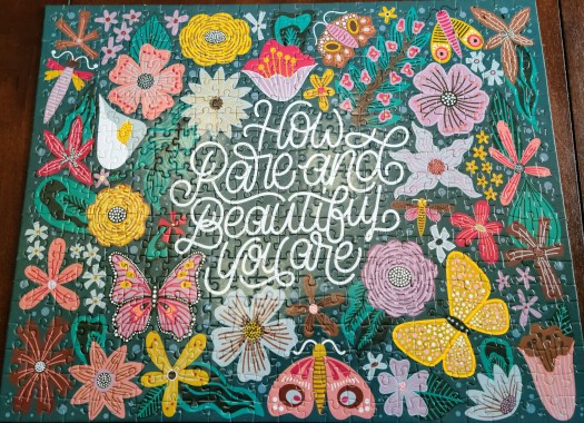 For the second puzzle, Suzanne chose Waterfall Camper, a 300-piece puzzle from Ceaco. The artist is Stephanie Peterson Jones. I have a bunch of her puzzles and really like her artwork.