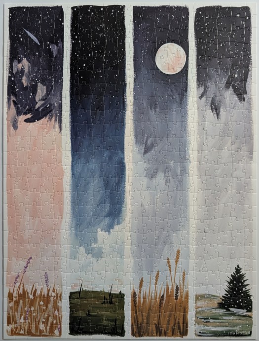Starry Seasons is a 500-piece puzzle from 1canoe2. This gorgeous puzzle was on my wish list for a long time, but I kept passing it up due to the price tag. Then the brand had a $15 sale on their website, and I snatched this one up right away. I just love the vertical grid design and how beautifully each season is represented.