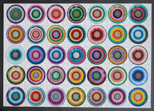 I love that this has both a rainbow and a grid aspect. This was a very quick build for me. After doing the border, I started with the pink column and worked my way over to the green. Then I jumped to the red and worked my way back to the yellow. The fit was kind of loose, so I’m guessing this puzzle has been done quite a few times already, but the pieces were still in pretty good shape.