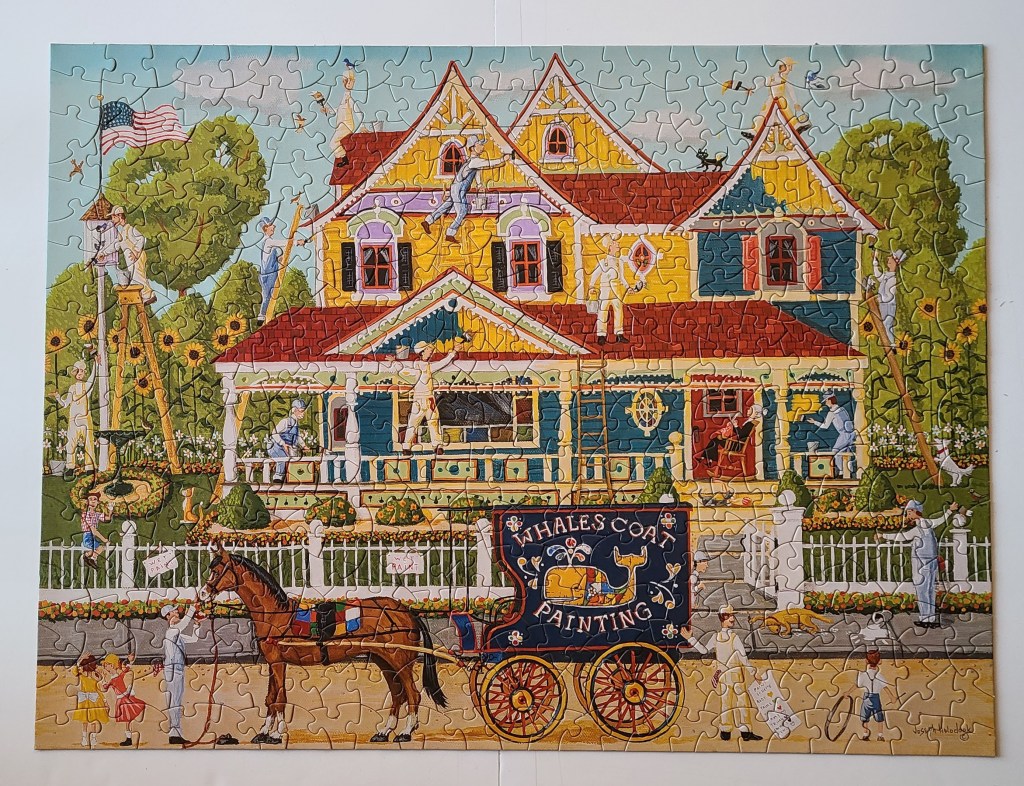 These two were definitely more fun than the other ones. The fall one was tricky, but the winter one was diabolically hard between the random cut pieces and the many shades of white and gray. The summer puzzle was the easiest of the four because it has more colorful elements that are spread out more throughout the design.