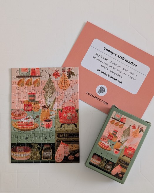 These puzzles come in a clear plastic tube with a screw-top lid. The packaging is super cute, but it does make it hard to look at the puzzle image as it is wrapped around the outside of the tube.
