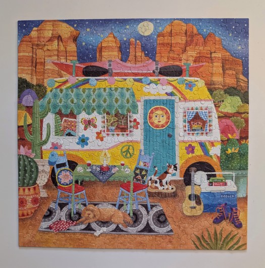 Despite my mishap, it was a fun puzzle. I really like the Boho elements against the background of camping in nature. I have done a few Magnolias and been happy with the quality. It’s one of the few I have found where you can move whole sections around easily, which is nice when you have two people working together.