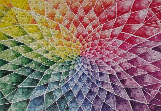 The first puzzle I did was Sugar Spectrum from the brand Fred. It was 500 pieces, and the artist was Emily Blincoe. It is a classic rainbow style puzzle and was a lot of fun, as well as being pretty easy. I have done several puzzles of this style, and this one was a good representation of it.