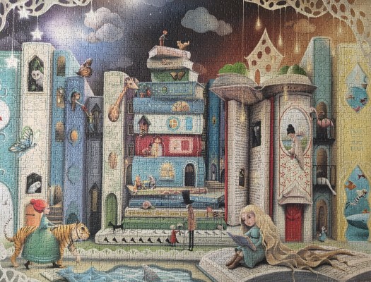 Novel Avenue is a 2000-piece puzzle from Ravensburger, and the artist is Demelsa Haughton. This was my first puzzle larger than 1000 pieces. It was intimidating due to the larger piece count, but once I got into it, it was definitely doable.