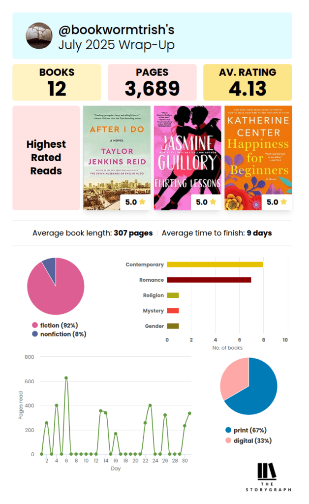 - At the end of June, I created a focused reading list of 25 books I would like to read by the end of the year. So far, I have read 23 of those books. One was a DNF, and the last one is still on hold with Libby, so I’m hoping it will be available in time.
