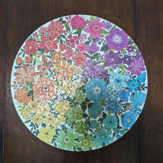 The colors in this puzzle are gorgeous, and the quality is impressive! The pieces were a nice thickness and fit together well. I started with the border and then worked my way from the outer green and blue up to the purple edge. The greens and orange went pretty well, but then I got a big bogged down in the reds. I kept working it and eventually got to the purples, which were a lot easier.